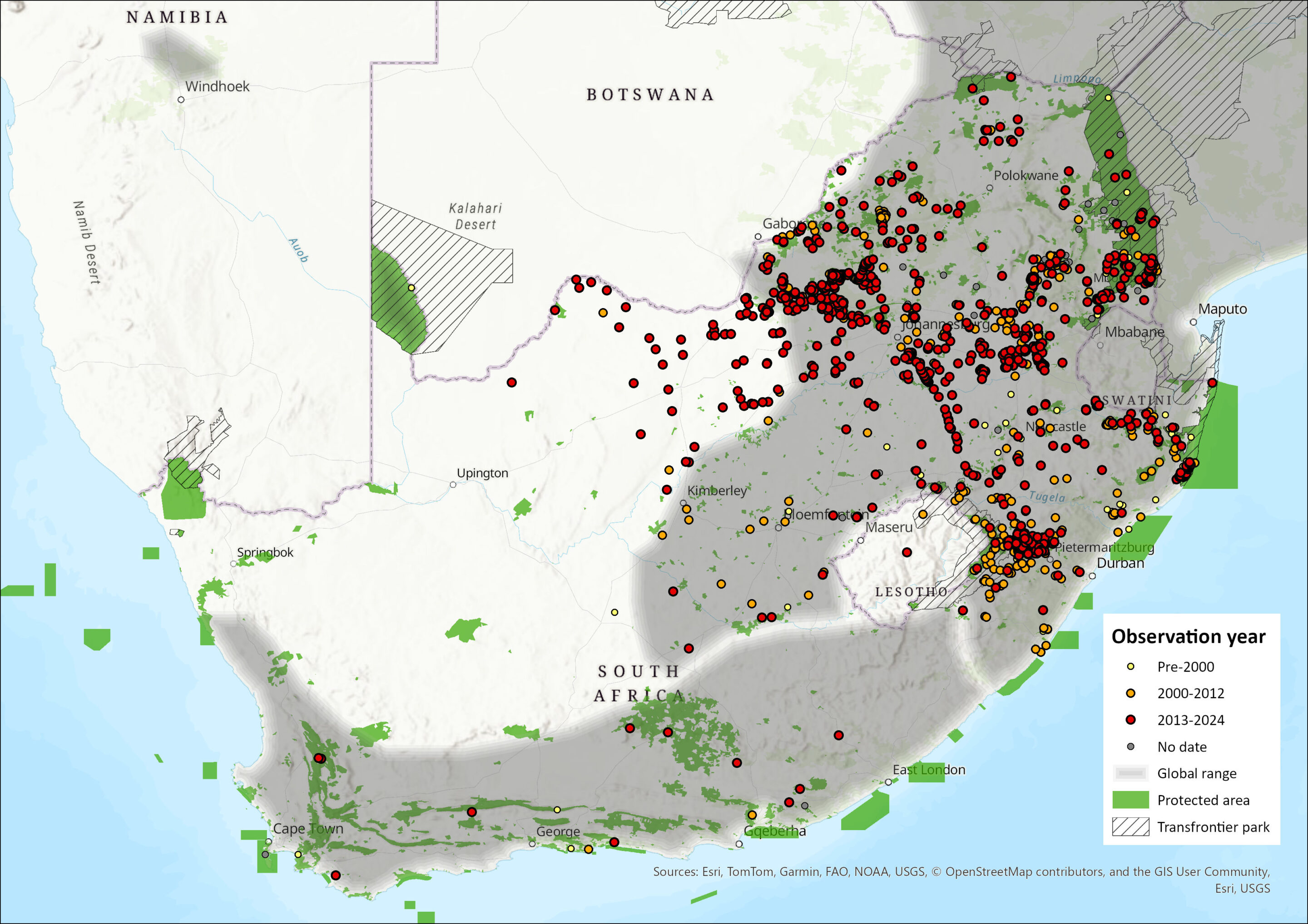 Figure 1. Distribution records for Serval (Leptailurus serval) within the assessment region (South Africa, Eswatini and Lesotho). Note that distribution data is obtained from multiple sources and records have not all been individually verified