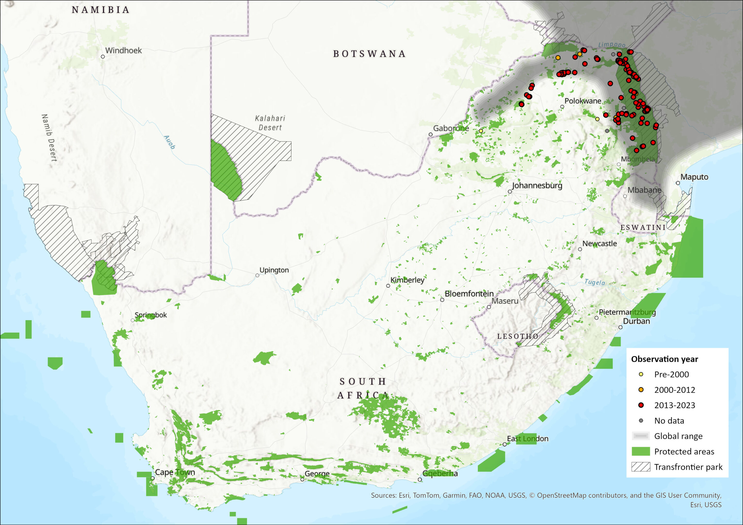 Figure 1. Distribution records for Sharpe’s Grysbok (Raphicerus sharpei) within the assessment region (South Africa, Eswatini and Lesotho). Note that distribution data is obtained from multiple sources and records have not all been individually verified.