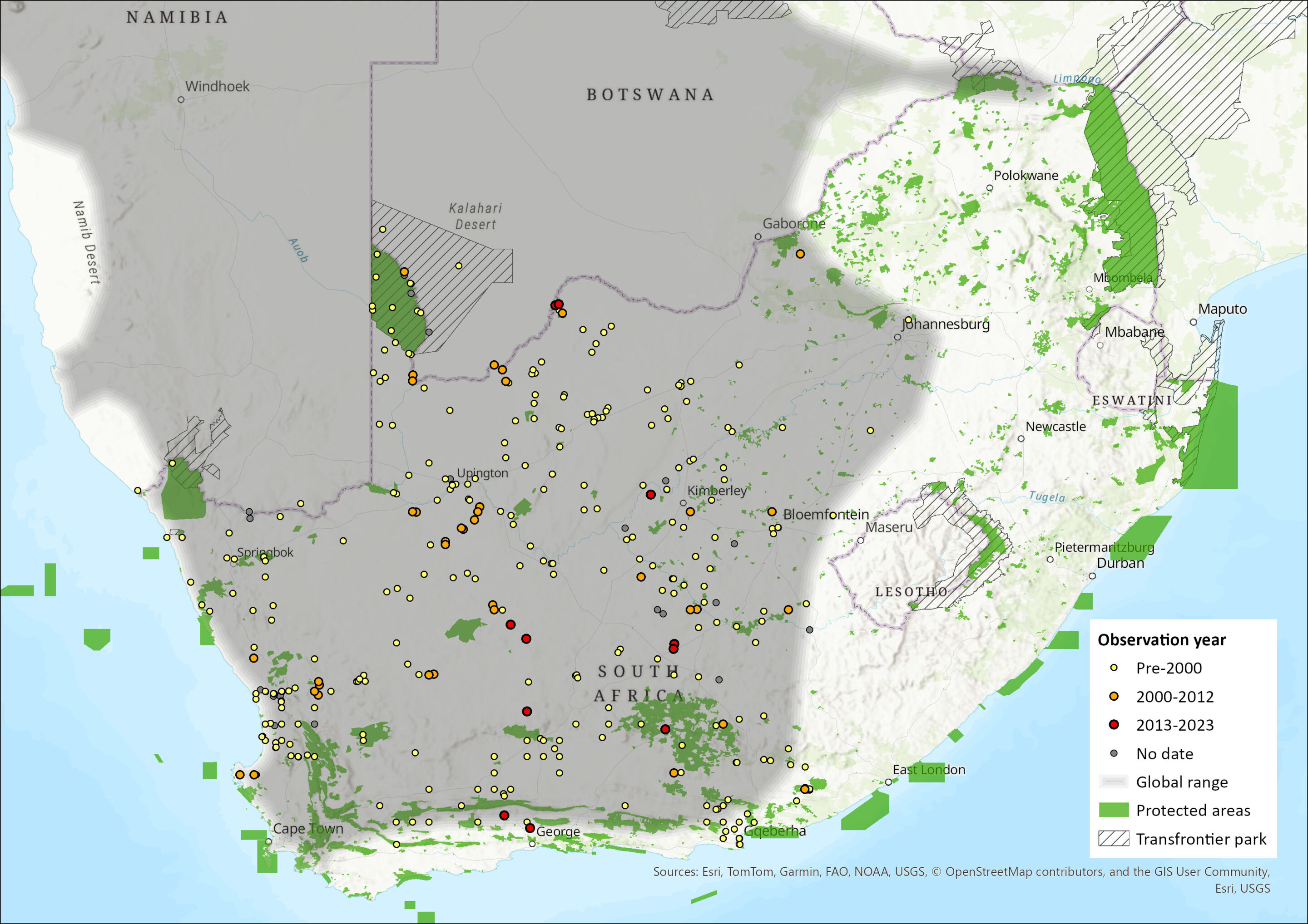 Figure 1. Distribution records for Short-tailed Gerbil (Desmodillus auricularis) within the assessment region (South Africa, Eswatini and Lesotho). Note that distribution data is obtained from multiple sources and records have not all been individually verified.