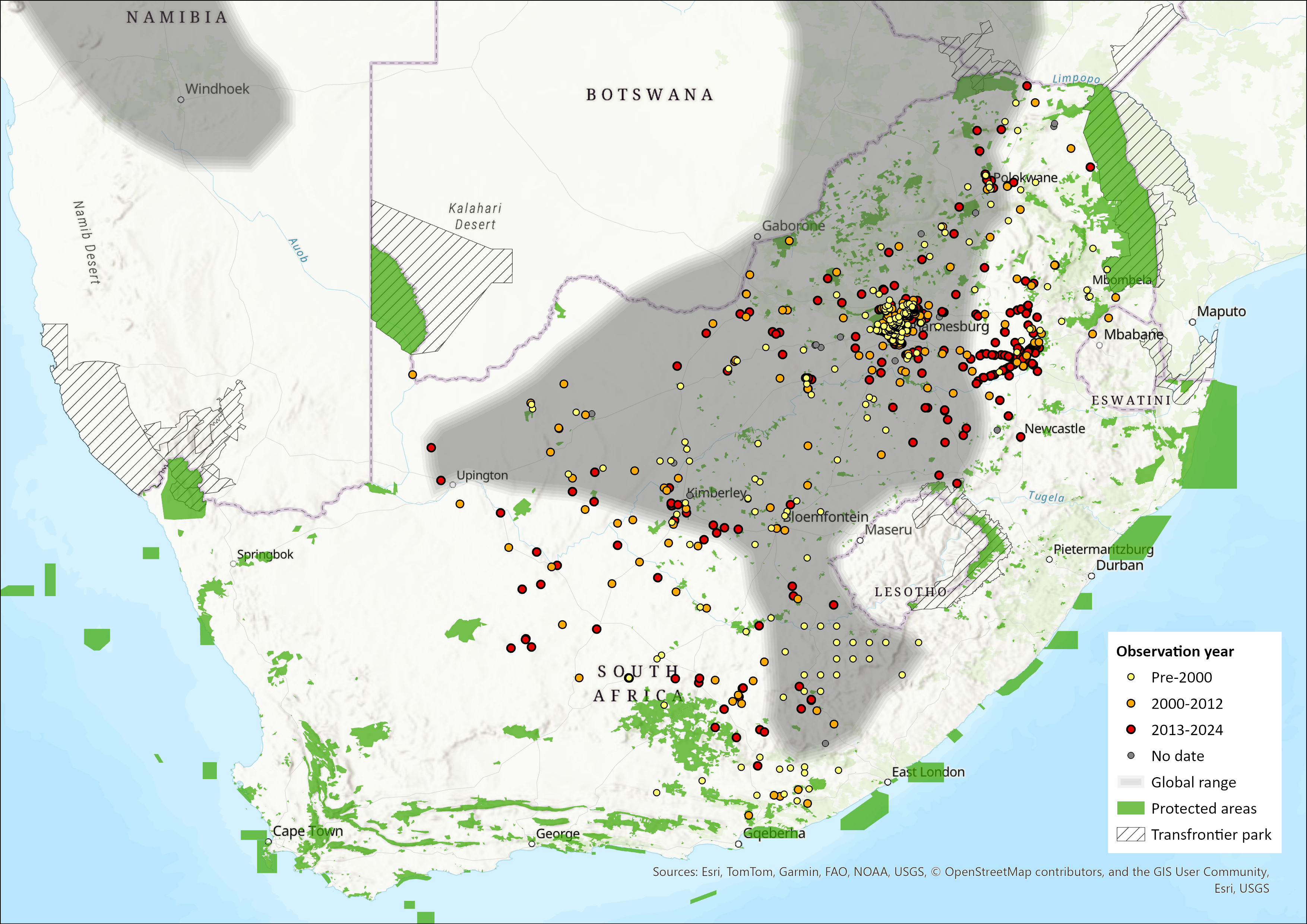 Systematic sampling across the species’ range and collection of incidental sightings data are greatly needed to further establish to what degree a range contraction has taken place. For example, there is much controversy about whether the species distribution is truly discontinuous. Morphometric analysis found low levels of variation between the two populations within the southern African distribution, suggesting a recent separation or ongoing movement (Rotherham 2007). With little development in the Kalahari Desert and no records found in the area, it would require extensive sampling to provide evidence of a continuous distribution.