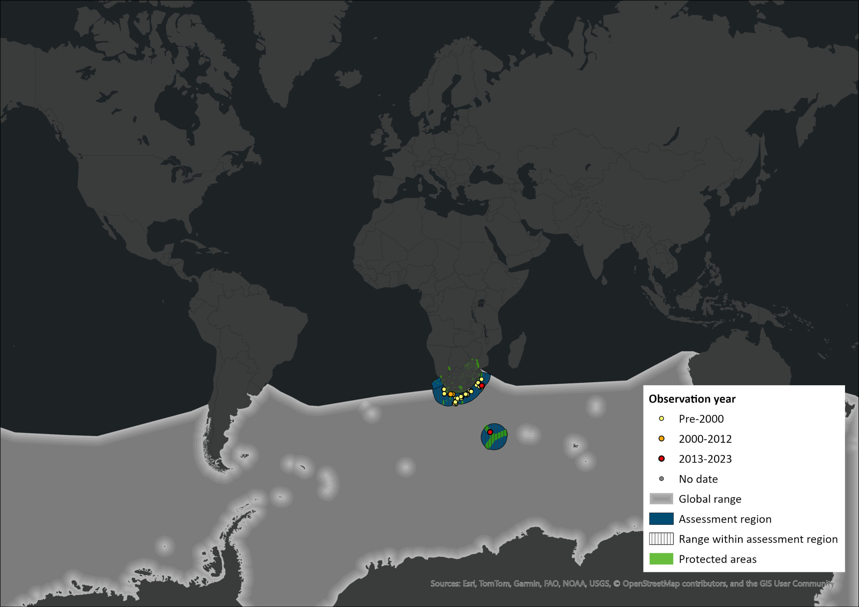 Figure 1. Distribution records for Southern Bottlenose Whale (Hyperoodon planifrons) within the assessment region (South Africa, Eswatini and Lesotho). Note that distribution data is obtained from multiple sources and records have not all been individually verified.