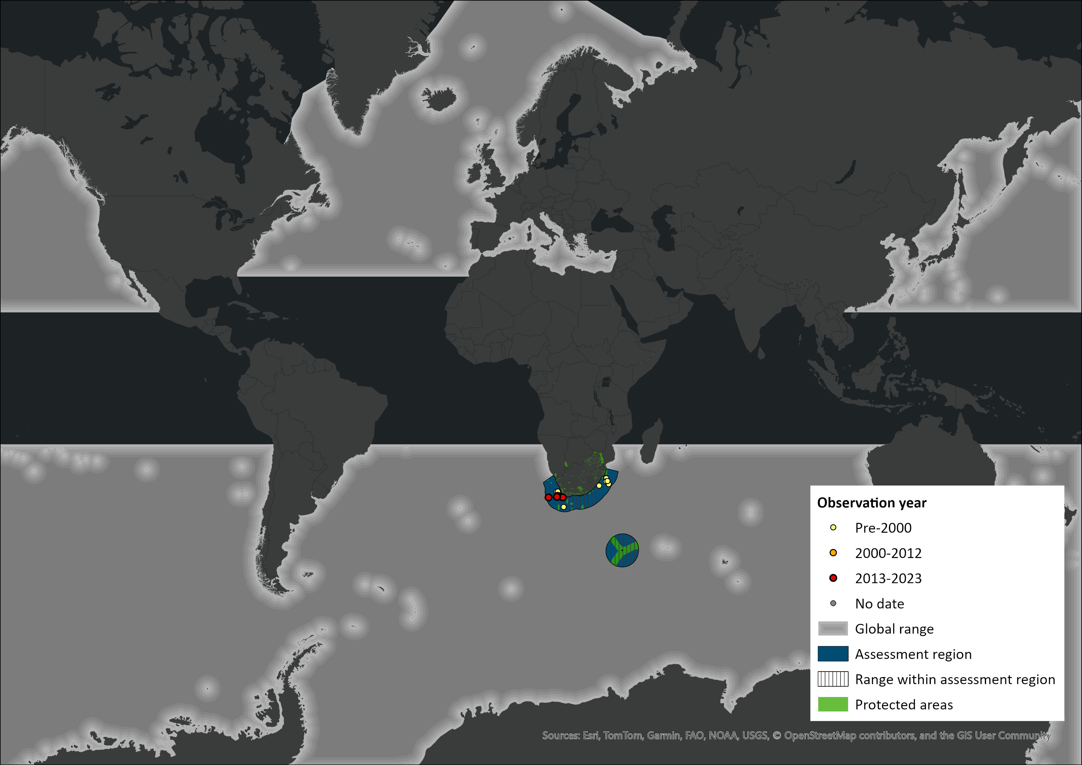Figure 1. Distribution records for Fin Whale (Balaenoptera physalus) within the assessment region (South Africa, Eswatini and Lesotho). Note that distribution data is obtained from multiple sources and records have not all been individually verified.