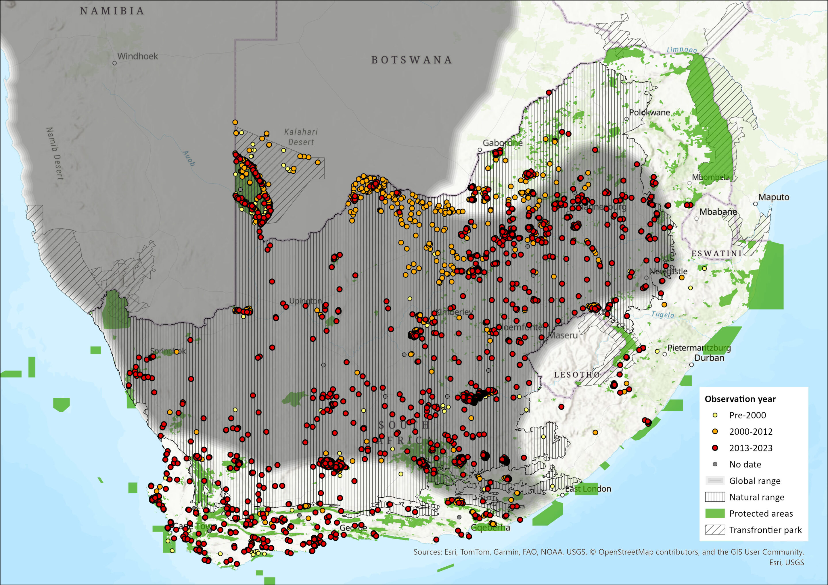 Chelsmford Nature Reserve in KwaZulu-Natal falls within the natural distribution range and thus is included in the population estimate. While no formally protected subpopulations exist in Limpopo, some private subpopulations do. It is unclear whether these are extralimital as property coordinates are not available. They are included in the population estimate. Similarly, for Mpumalanga, while one private nature reserve is known to fall within the natural range, the other is not (due to missing coordinates). For formally protected areas, while we include Nooitgedachtdam Dam Nature Reserve (as it is on the border of the natural range) we exclude Songimvelo Nature Reserve as it falls significantly outside the natural range. In both Limpopo and Mpumalanga provinces (as well as the Cape provinces), the numbers of private subpopulations are likely to be significantly more extensive, but no comprehensive data are available at present. Further collation of such data is important. However, not all private subpopulations will count towards the wild population if they are intensively managed. Further research is required to determine which private subpopulations are eligible.