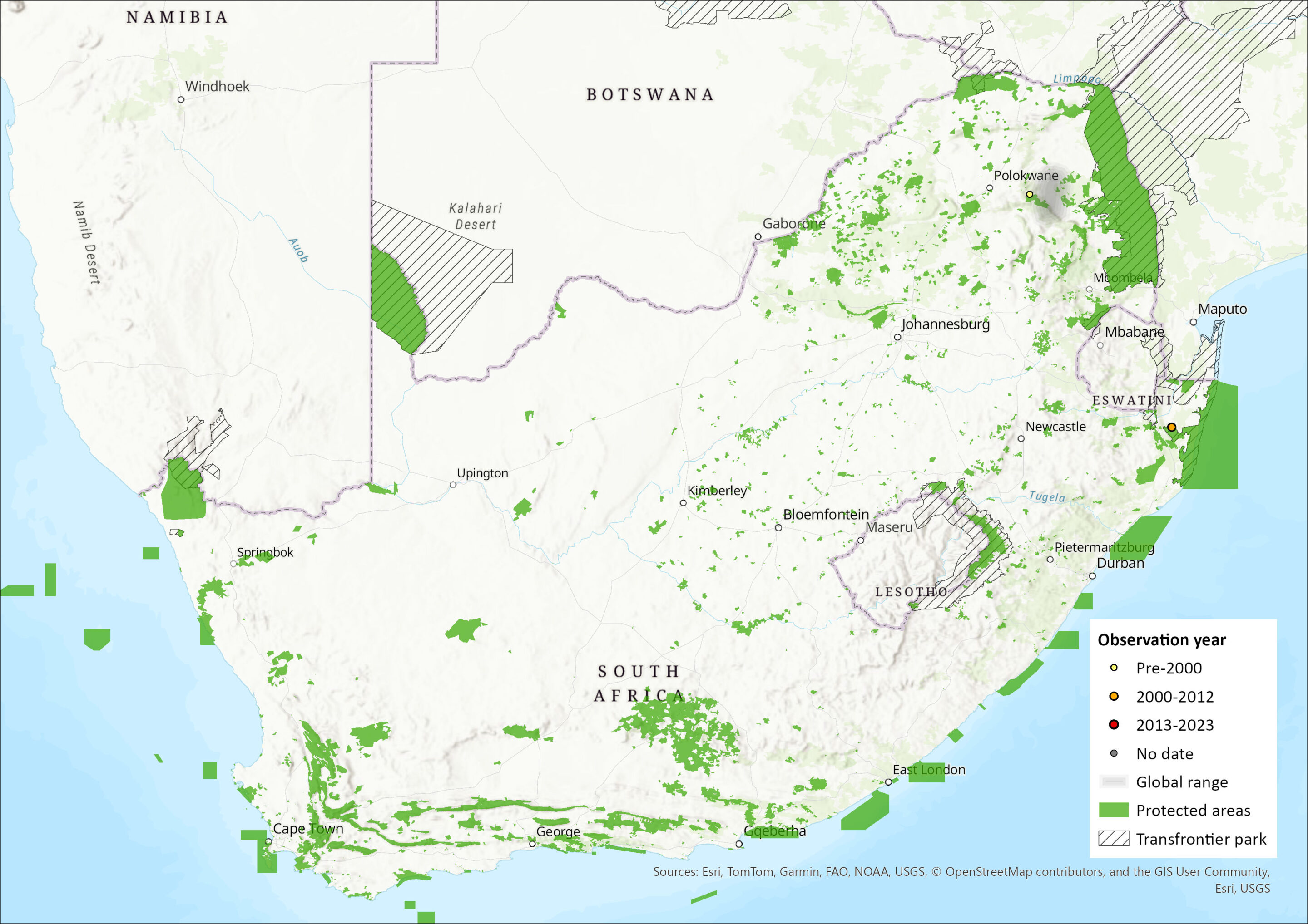 Within the assessment region, it is only known from two localities at present: Wolkberg Wilderness Area in Limpopo Province, where Newbery and Bronner (2002) first confirmed the presence of the species within the assessment region, and Mkhuze Game Reserve in KwaZulu-Natal (Figure 1), which was identified both morphologically and genetically (Lamb et al. 2014). There is a MammalMap record of the species from Pretoriuskop in Kruger National Park in 2016, but this record requires verification. Newbery and Bronner (2002) suggest that the species may be more widespread in Limpopo, but additional surveying is needed to determine the extent of its distribution in the assessment region.