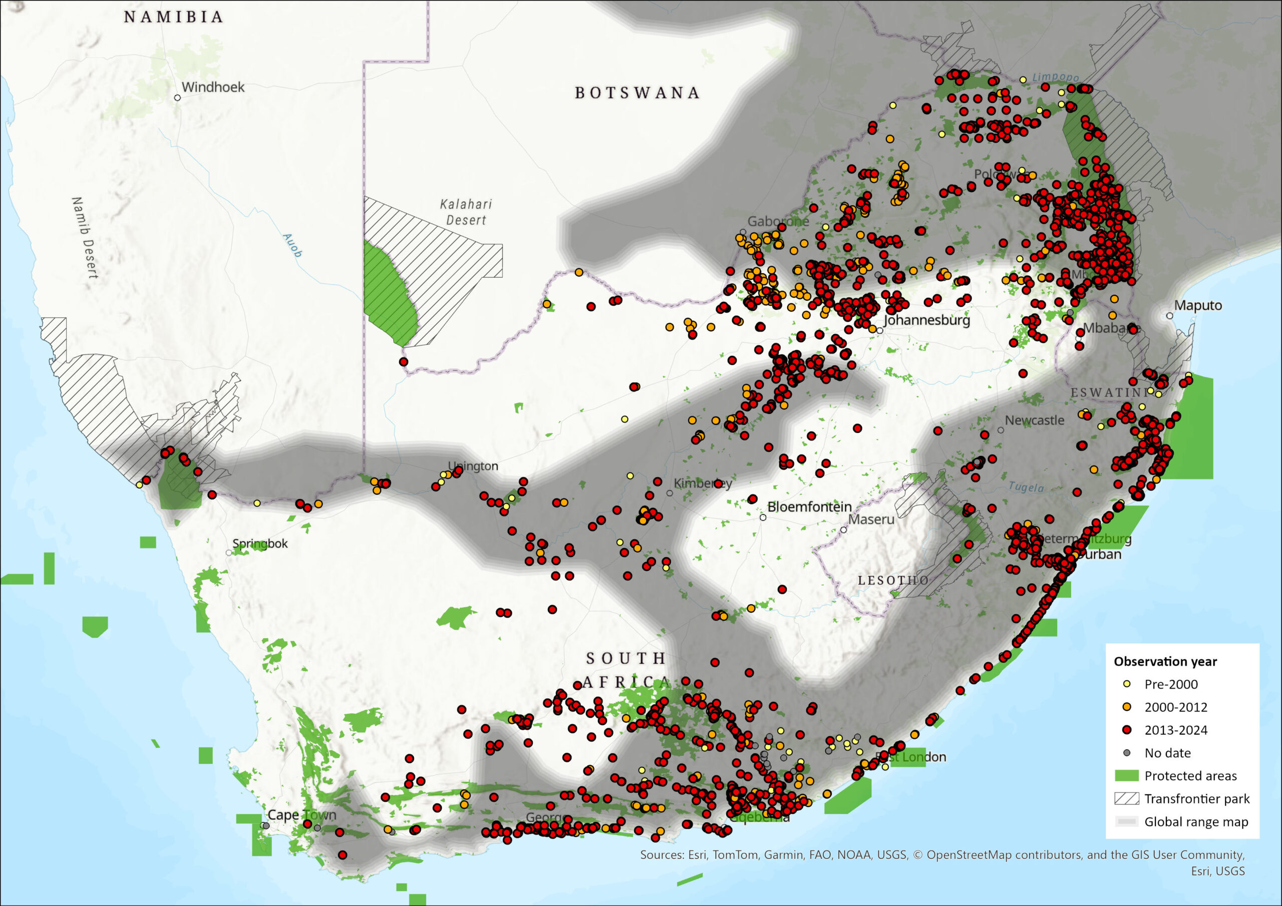 Figure 1. Distribution records for Vervet Monkey (Chlorocebus pygerythrus) within the assessment region (South Africa, Eswatini and Lesotho). Note that distribution data is obtained from multiple sources and records have not all been individually verified.