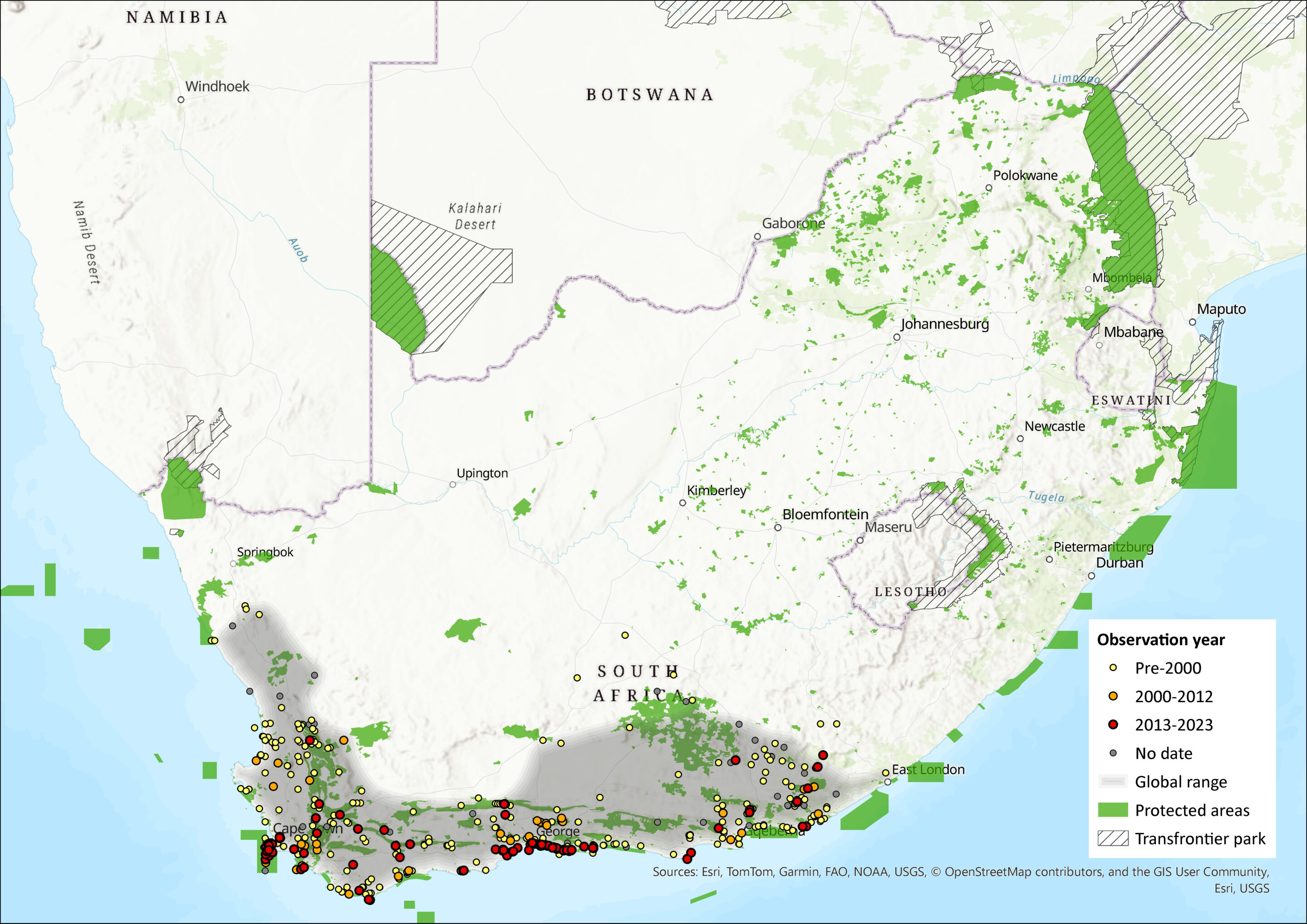 2) Climate change is projected to reduce AOO by 12-24% by 2050 through decreasing habitat suitability (Taylor et al. 2016). Most of these habitat declines will occur in the Western Cape because, while the fynbos component of the Eastern Cape will be reduced (Cowan 2025), the species is able to persist in thicket habitats and thus its future distribution in this region will be relatively unaltered. Climate change distribution models for this species do not indicate a significant decline for this species (Cowan 2025).