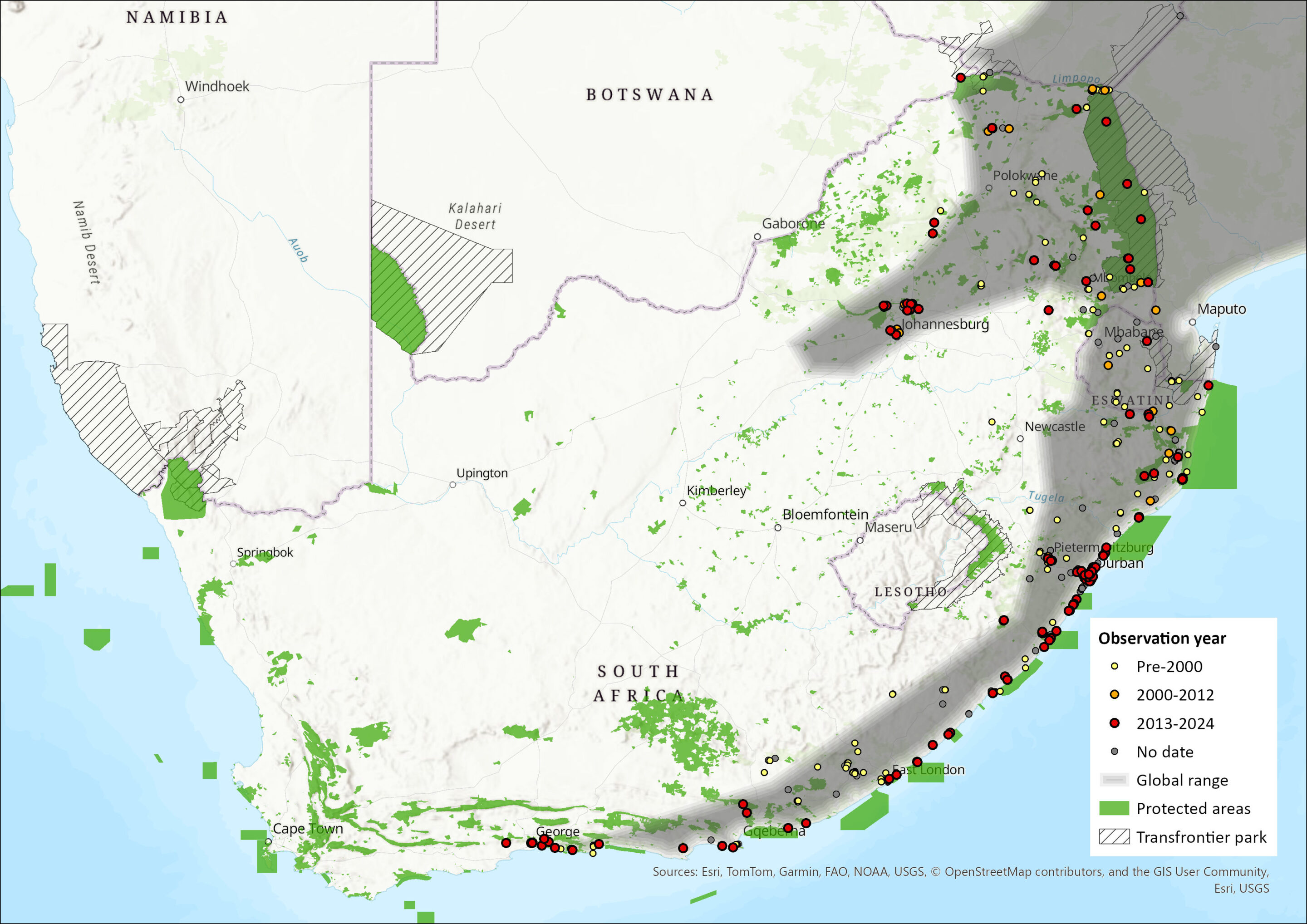 Figure 1. Distribution records for Wahlberg’s Epauletted Fruit Bat (Epomophorus wahlbergi) within the assessment region (South Africa, Eswatini and Lesotho). Note that distribution data is obtained from multiple sources and records have not all been individually verified.